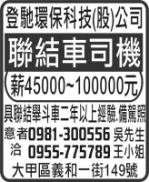 瀏覽廣告 人事求才、信用貸款、店面頂讓、開店優惠、生活娛樂、....分類廣告。 類別: 所有類別 人事求才(山線)人事求才(海線)信用貸款商店優惠房地產廣告綜合分類 Page 14 of 31«««1213141516»»» 髮 型 設 計 美髮助理 2025/12/01 瀏覽次數: 3 協威特殊金屬 (股) 公司 操 作 員 2025/12/01 瀏覽次數: 8 瑞峰企業社 烤漆浪板安裝 工作伙伴 2025/12/01 瀏覽次數: 4 山豬別館餐廳 動植物照服員 2025/12/01 瀏覽次數: 1 宜瑪科技 (股) 公司 作業員 2025/12/01 瀏覽次數: 10 水 電 技工 半技工 水電 技工 半技工 2025/12/01 瀏覽次數: 1 環保工程 行政助理 大貨車司機 隨車人員 2025/12/01 瀏覽次數: 1 福克斯保全 夜班保全員 2025/12/01 瀏覽次數: 2 永利豐公司 送貨司機 2025/12/01 瀏覽次數: 0 耐用 水泥製品(股)公司 推土機司機 混凝土外務人員 2025/12/01 瀏覽次數: 1 Page 14 of 31«««1213141516»»» Ads per page: 5 10 20 30 40 50 60 70 80 90 100 500