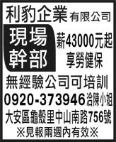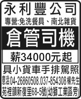 瀏覽廣告 人事求才、信用貸款、店面頂讓、開店優惠、生活娛樂、....分類廣告。 類別: 所有類別 人事求才(山線)人事求才(海線)信用貸款商店優惠房地產廣告綜合分類 Page 20 of 31«««1819202122»»» 全省科技廠 室內工程電工 / 配管學徒 2025/11/25 瀏覽次數: 3 三 丸 電 線 廠 臨時廠工 正職人員 兼職人員  ... 2025/11/25 瀏覽次數: 23 皇品排骨飯 兼職人員 2025/11/25 瀏覽次數: 0 淮茂有限公司 兼 職 作 業 員 2025/11/25 瀏覽次數: 6 兼職銀行清潔員 兼職銀行清潔員 2025/11/25 瀏覽次數: 4 任運成機電工程有限公司電力工程 工安人員 水電師傅 學徒 文書人員 半技... 2025/11/25 瀏覽次數: 3 工地長期 粗工/臨時工 工地長期 粗工/臨時工 2025/11/25 瀏覽次數: 2 溫莎堡 合法經營汽車旅館 早班房務人員 2025/11/25 瀏覽次數: 4 寬門‧海味日常 廚 師 外場人員 廚房助手 櫃檯人員 2025/11/25 瀏覽次數: 4 豐原上楓牛肉麵 全職人員 2025/11/25 瀏覽次數: 1 Page 20 of 31«««1819202122»»» Ads per page: 5 10 20 30 40 50 60 70 80 90 100 500