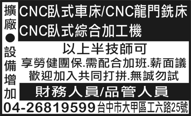 CNC臥式車床/CNC龍門銑床 CNC臥式綜合加工機 財務人員/品管人員 CNC臥式車床/CNC龍門銑床 CNC臥式綜合加工機 財務人員/品管人員 點選可放大影像 聯絡資訊 更多資訊 CNC臥式車床/CNC龍門銑床 CNC臥式綜合加工機 財務人員/品管人員 已被瀏覽 3 次.
