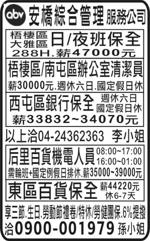 安橋綜合管理 服務公司 安橋綜合管理 服務公司 點選可放大影像 聯絡資訊 更多資訊 梧棲區大雅區日/夜班保全 梧棲區/南屯區辦公室清潔員 西屯區銀行保全 后里百貨機電人員 東區百貨保全 已被瀏覽 5 次.