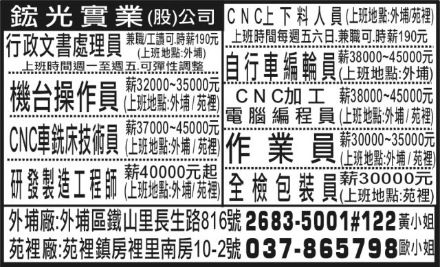 鋐光實業 (股)公司 鋐光實業 (股)公司 點選可放大影像 聯絡資訊 更多資訊 機台操作員 CNC車銑床技術員 研發製造工程師 行政文書處理員 作業員 CNC加工電腦編程員 自行車編輪員 全檢包裝員 CNC上下料人員 已被瀏覽 25 次.