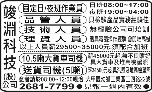 竣 淵 科 技 (股) 公司 竣 淵 科 技 (股) 公司 點選可放大影像 聯絡資訊 更多資訊 10.5噸大貨車司機 送貨司機(5噸) 固定日/夜班作業員 品 管 人 員 技 術 人 員 理 貨 人 員 已被瀏覽 10 次.