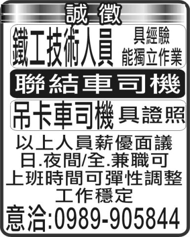 鐵工技術人員 聯結車司機 吊卡車司機